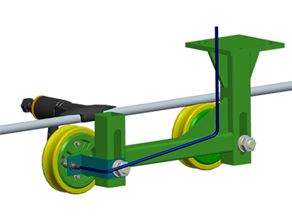 在托輪的下方全線路上設(shè)置一根鋼絲繩,當?shù)跻伟l(fā)生過擺時,防過擺的鋼絲繩將吊椅擋回去,使吊椅恢復(fù)正常位置。