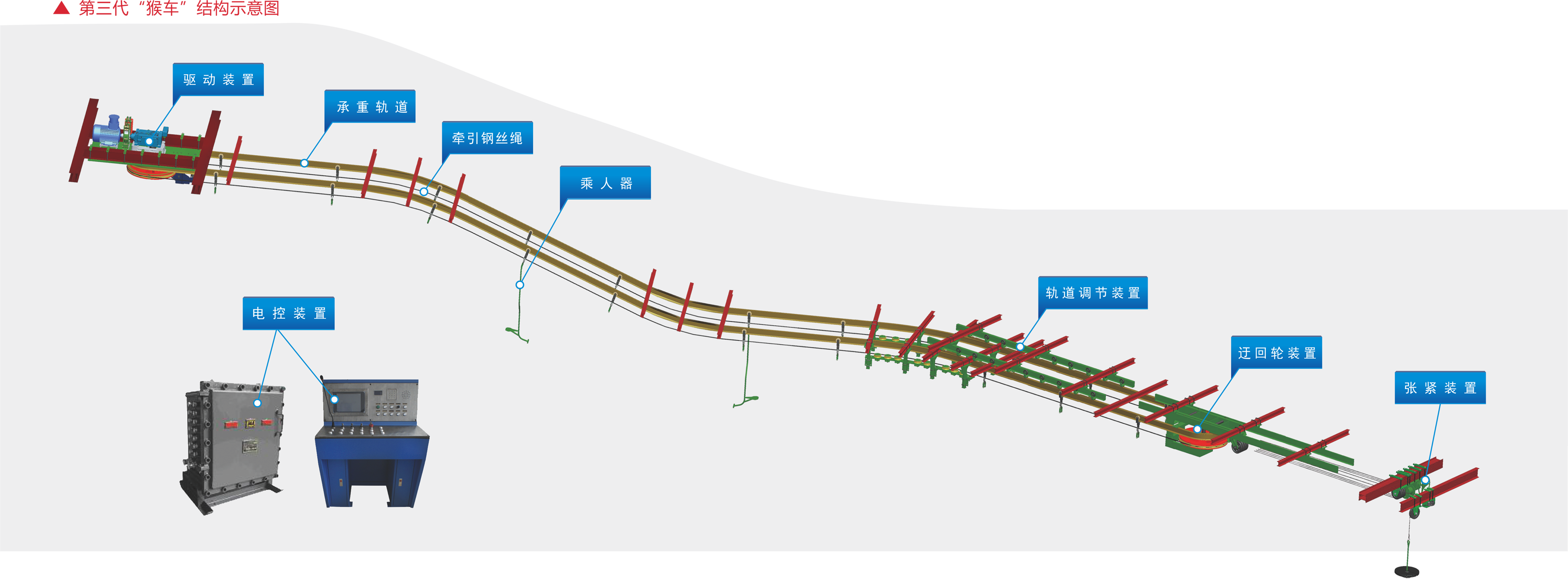 礦用繩牽引軌道式架空乘人裝置是傳統(tǒng)“猴車”更新?lián)Q代的產品。它主要由驅動裝置、承重軌 道、牽引鋼絲繩、乘人器、迂回輪裝置、軌道調節(jié)裝置、張緊裝置、安全保護裝置及電控裝置等組 成。具有不掉繩、防脫繩、適用于大坡度多個同向彎或“S”型彎的巷道條件;且運量大、乘坐更舒適、安全性能更高,是一種新型的現(xiàn)代化礦山井下人員輸送設備。
