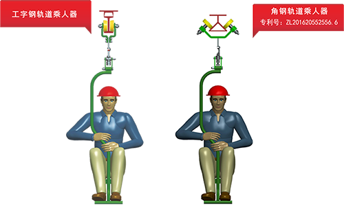 乘人器分為工字鋼軌道乘人器和角鋼軌道乘人器, 乘人器組成主要由 滾輪組件、 滾輪支架、 抱索器(專利號:ZL 201410620073.0 )、 連接板、 吊椅等組成。