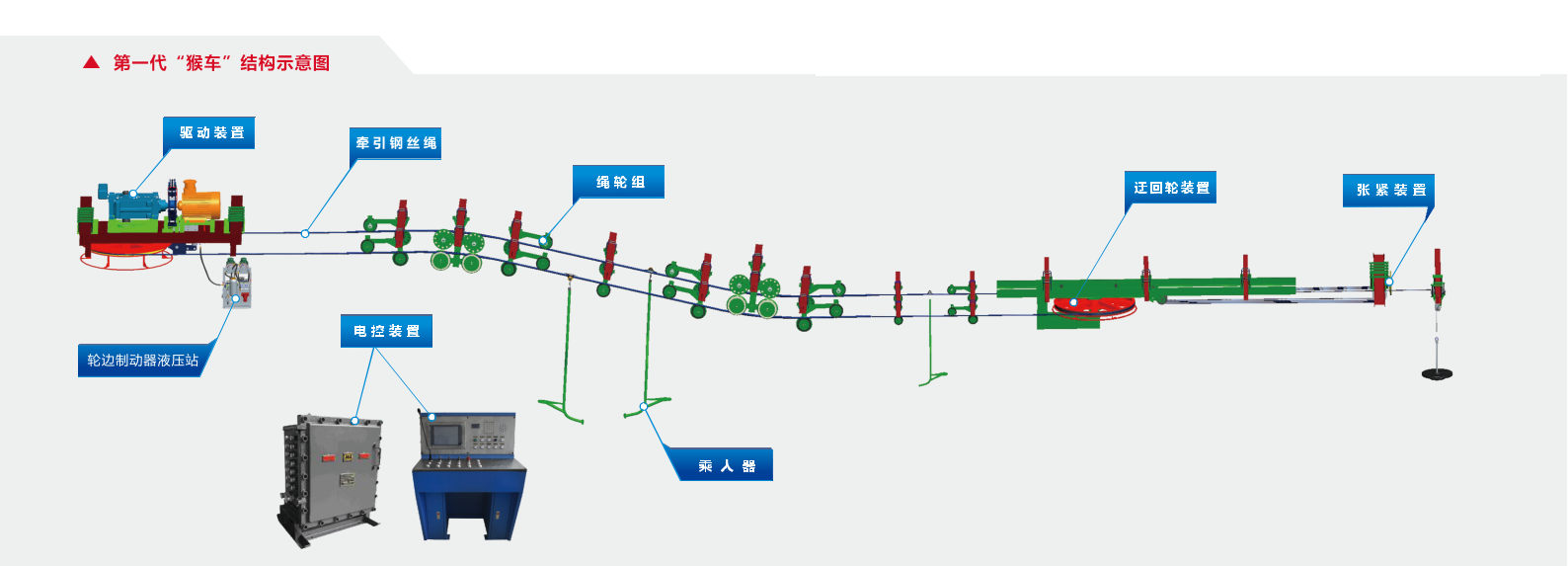 第一代“猴車”——機(jī)械驅(qū)動式架空乘人裝置(俗稱“機(jī)械猴車”)