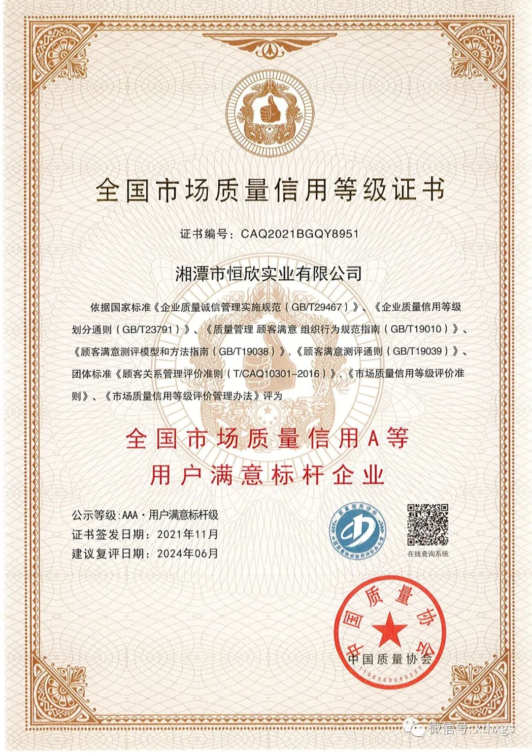 2021年12月7日,【湘潭恒欣】被中國質量協(xié)會(以下簡稱“中質協(xié)”)評定為用戶滿意標桿企業(yè)(全國市場質量信用AAA),湖南省質量協(xié)會楊凡球副秘書長為【湘潭恒欣】授牌。來自全國各行業(yè)共11家企業(yè)榮獲此殊榮。