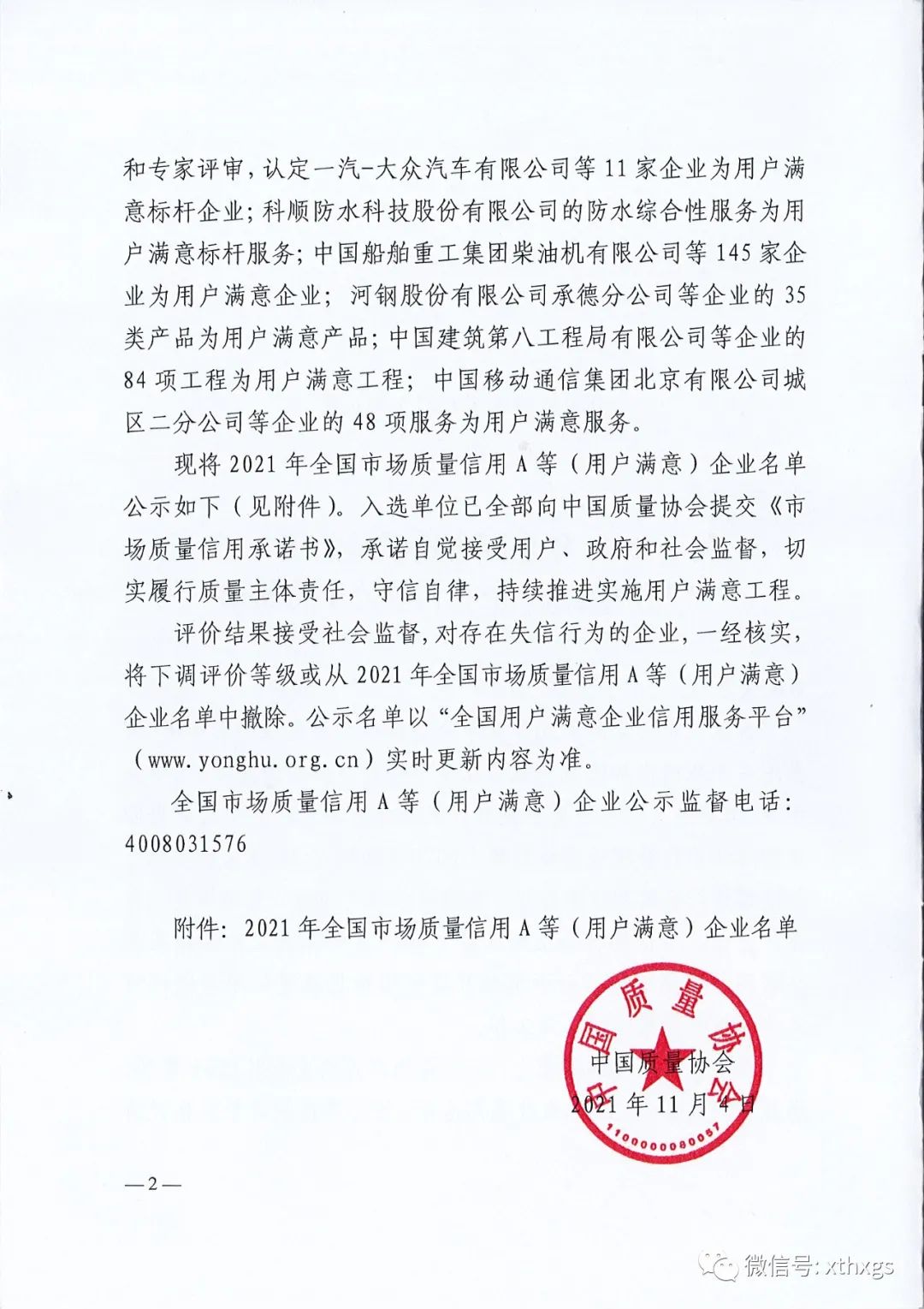 此次全國市場質量信用A等(用戶滿意)企業(yè)認定工作由中質協(xié)組織,其目的是加快推進社會信用體系建設,營造誠信、自律、守信、互信的社會信用環(huán)境。