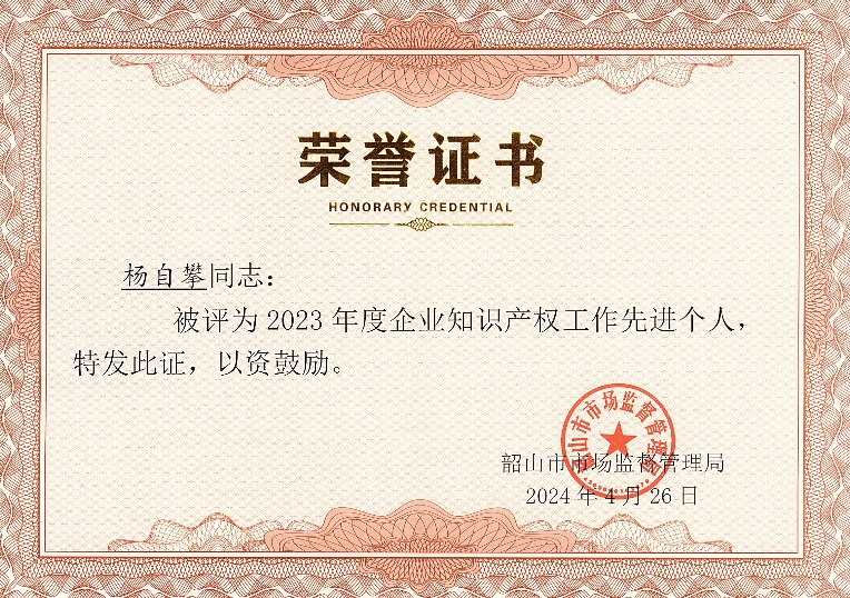 4月26日,韶山市委宣傳部和韶山市市場監(jiān)督管理局等單位聯(lián)合主辦了韶山市2024年“知識產(chǎn)權(quán)宣傳周”主題活動(dòng)?;顒?dòng)現(xiàn)場上,由韶山市委常委、副市長鄒正光為榮獲知識產(chǎn)權(quán)榮譽(yù)的企業(yè)和個(gè)人進(jìn)行頒獎(jiǎng)和授牌。董事長肖公平接受鄒副市長為【恒欣股份】獲評國家知識產(chǎn)權(quán)示范企業(yè)的授牌,【恒欣股份】知識產(chǎn)權(quán)辦主任楊自攀被評為企業(yè)知識產(chǎn)權(quán)工作先進(jìn)個(gè)人。