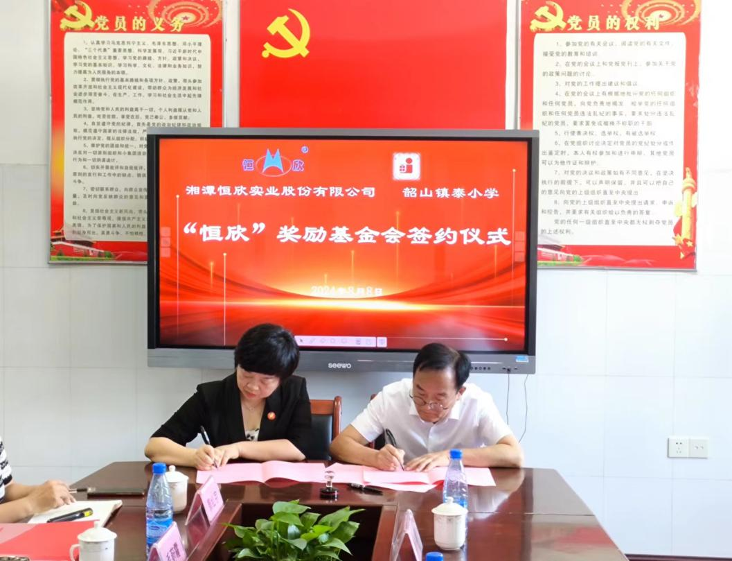 2024年8月8日,【恒欣股份】與韶山鎮(zhèn)泰小學就共同成立“恒欣”獎勵基金會舉行簽約儀式。韶山市委副書記劉志剛、韶山市教育局副書記、副局長張賽、【恒欣股份】董事長肖公平、總經(jīng)理肖龍武等出席簽約儀式,儀式由韶山市教育局原副局長胡勇衛(wèi)主持。