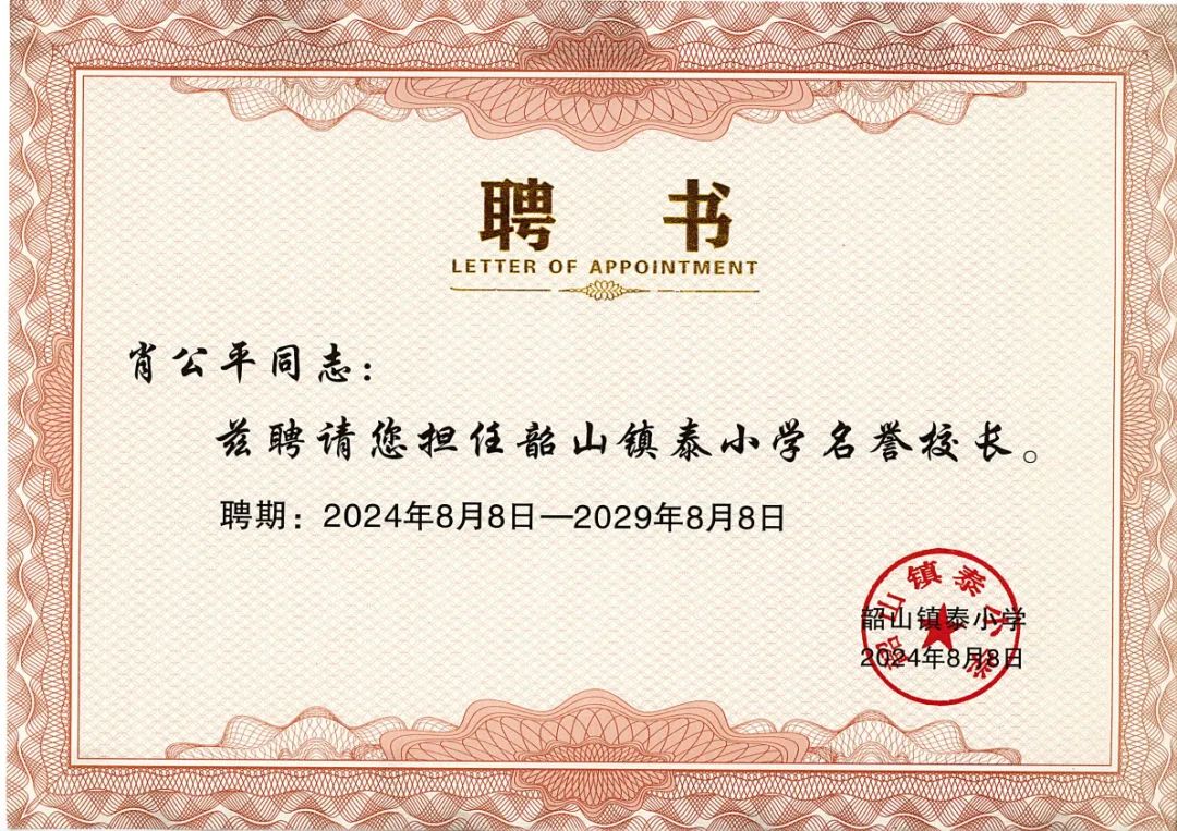 韶山市委副書記劉志剛對此次合作給予了高度評價,對【恒欣股份】的愛心表示感謝。由韶山市教育局副書記、副局長張賽為肖董事長頒發(fā)了鎮(zhèn)泰小學“名譽校長”的聘書。