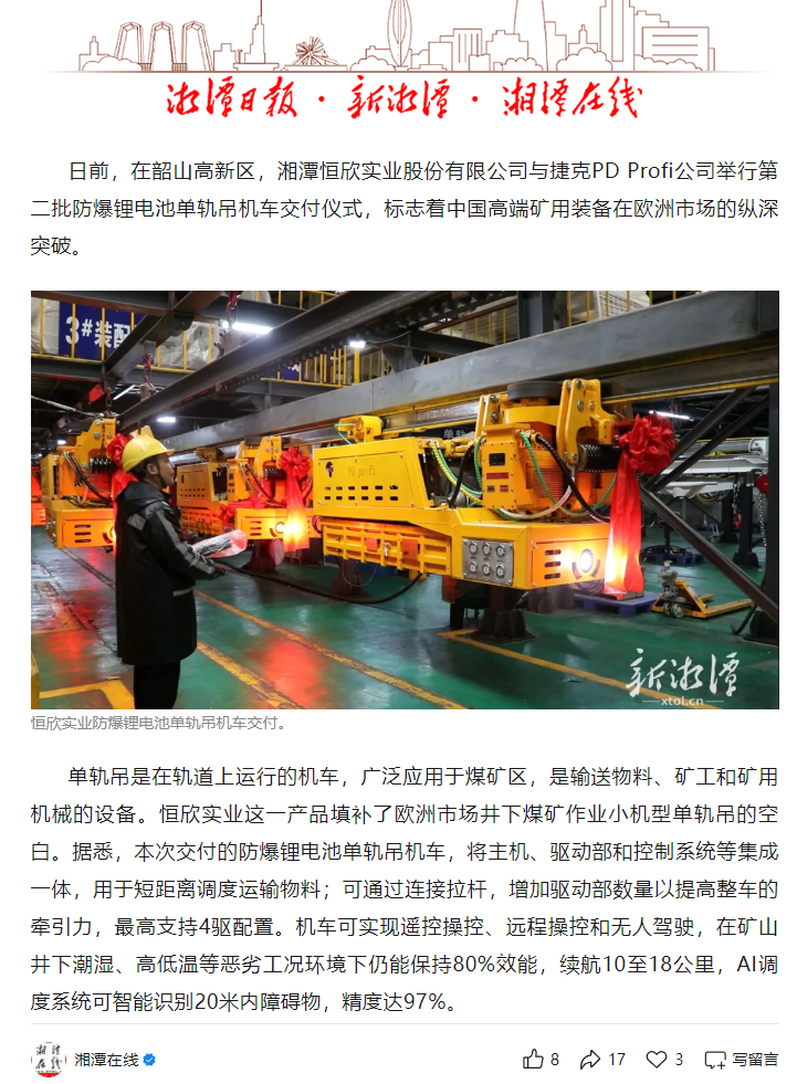 國內權威媒體報道我司單軌吊再次出口歐洲