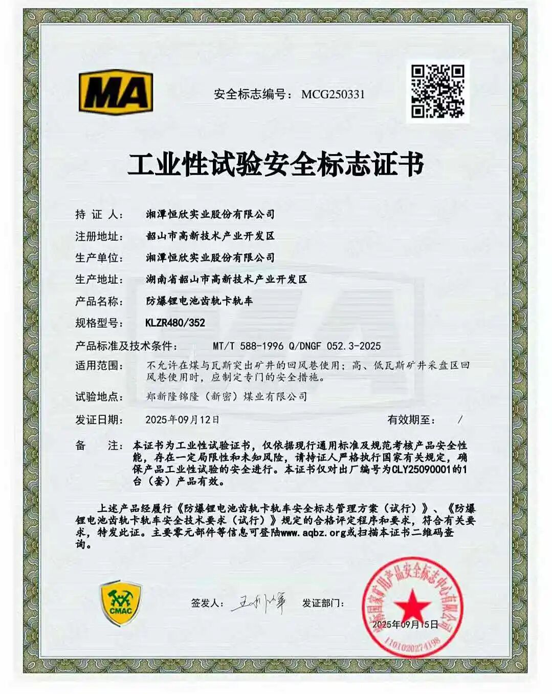 喜訊!【恒欣股份】科研團(tuán)隊(duì)歷時(shí)十個(gè)月技術(shù)攻關(guān)下成功面世的永磁變頻一體機(jī)系列的防爆鋰電池齒軌卡軌車(chē),取得業(yè)內(nèi)首批礦用產(chǎn)品安全標(biāo)志證書(shū)。這一重要突破,標(biāo)志著【恒欣股份】在礦山智能運(yùn)輸裝備領(lǐng)域已走在行業(yè)前沿。