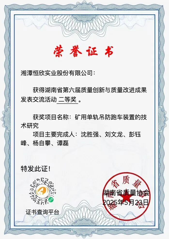 公司質(zhì)量管理工作亦在省級平臺上獲得高度認(rèn)可。在湖南省質(zhì)量協(xié)會第46次優(yōu)秀質(zhì)量管理小組表彰大會上,【恒欣股份】榮獲“湖南省第六屆質(zhì)量創(chuàng)新與質(zhì)量改進(jìn)成果”二等獎兩項,有軌QC小組獲“湖南省第46次QC小組成果二等獎”,充分體現(xiàn)了公司在質(zhì)量創(chuàng)新與實踐方面的綜合實力。