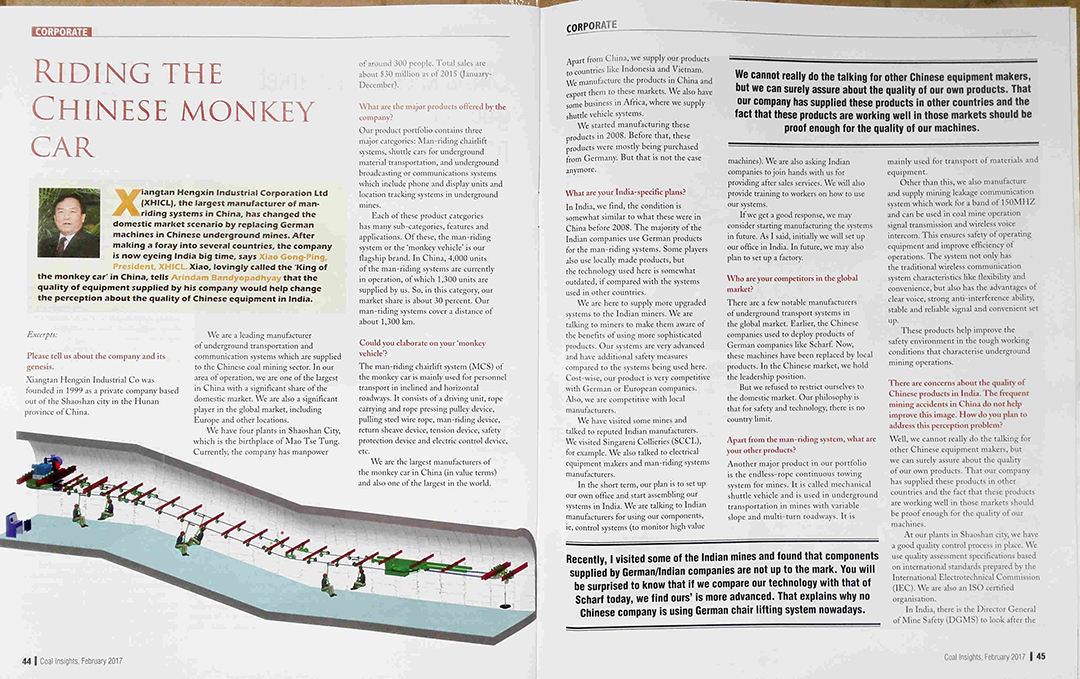 2016年12月,【湘潭恒欣】董事長(zhǎng)肖公平攜恒欣技術(shù)團(tuán)隊(duì)隨中國(guó)煤監(jiān)局訪問(wèn)印度各大煤礦公司及DGMS(印度礦山安全管理總局)。印度“Coal Insight”《煤業(yè)洞悉》雜志在中國(guó)考察團(tuán)到訪印度期間,邀請(qǐng)【湘潭恒欣】董事長(zhǎng)肖公平進(jìn)行專訪,并登上全球同步發(fā)行的2017年2月刊。作為印度煤礦行業(yè)最權(quán)威的媒體,《煤業(yè)洞悉》影響力舉足輕重。該雜志高度評(píng)價(jià)了【湘潭恒欣】在行業(yè)中的地位以及肖公平董事長(zhǎng)帶領(lǐng)團(tuán)隊(duì)所取得的成績(jī),并圍繞【湘潭恒欣】公司背景,產(chǎn)品信息,進(jìn)軍印度乃至全球市場(chǎng)的計(jì)劃進(jìn)行了高端訪談。