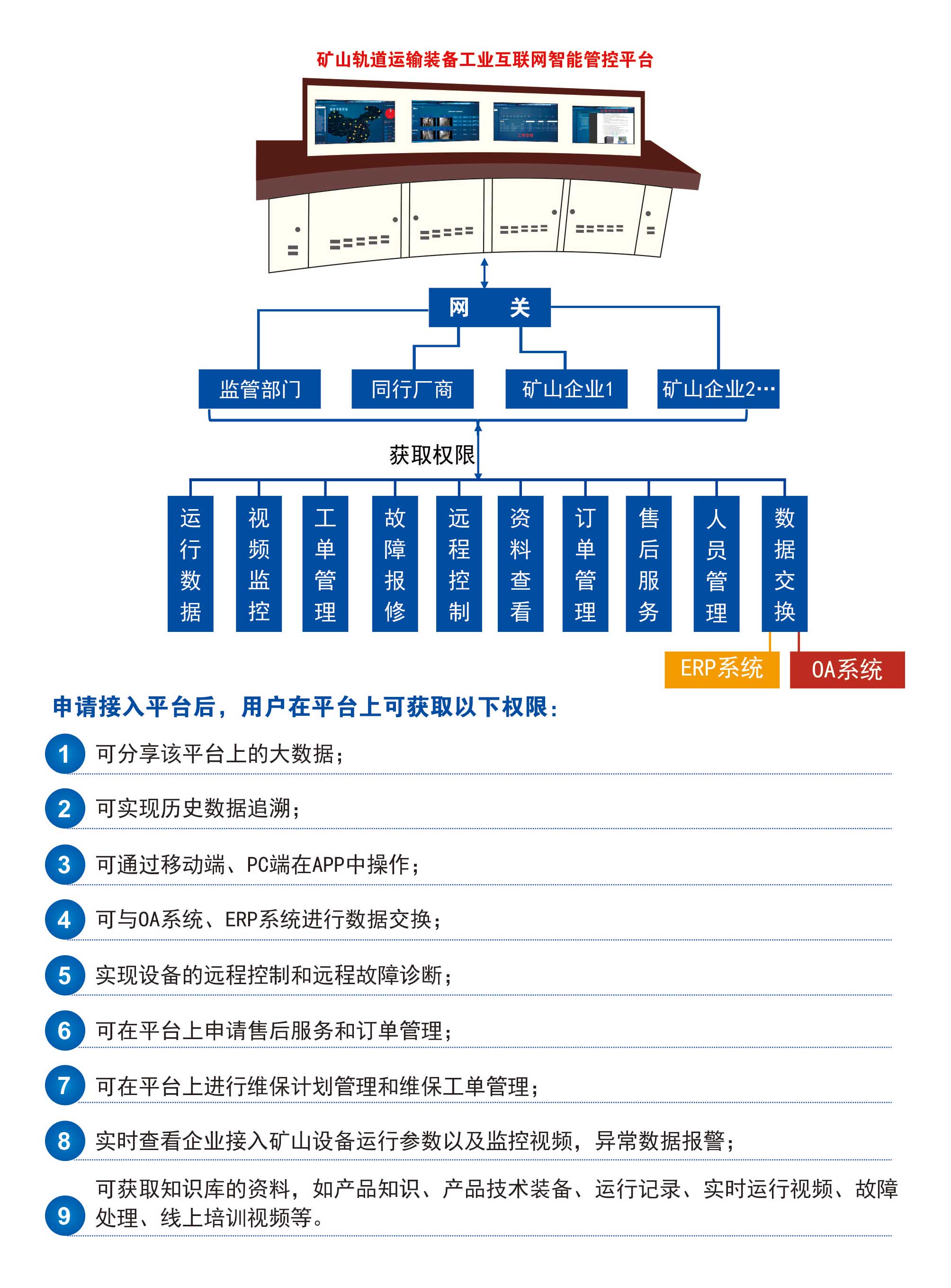 平臺用于對礦用礦山軌道運(yùn)輸智能裝備進(jìn)行實(shí)時監(jiān)控、運(yùn)行預(yù)報(bào)警、遠(yuǎn)程智能故障診斷以及數(shù)字運(yùn)維服務(wù)等,并通過工業(yè)APP實(shí)時調(diào)度設(shè)備運(yùn)維服務(wù)人員,及時處理設(shè)備故障,以提升礦山軌道運(yùn)輸智能裝備的安全運(yùn)維保障。平臺被列入湖南省“數(shù)字新基建”100個標(biāo)志性項(xiàng)目名單,2022年5月平臺通過了省級驗(yàn)收,成為全省十八塊“湖南省工業(yè)互聯(lián)網(wǎng)平臺”之一,平臺的工業(yè)APP入選“湖南省2021年優(yōu)秀工業(yè)APP”。