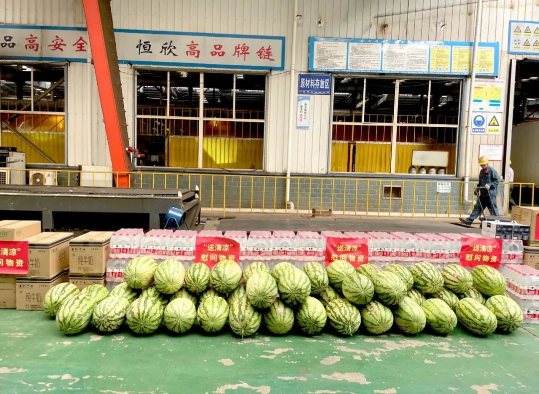 盛夏時節(jié),烈日炎炎。市委書記曹偉宏一行,在【恒欣股份】董事長肖公平的陪同下,來到車間為奮戰(zhàn)在高溫一線的員工送去了解暑降溫物品——防暑藥品、西瓜、礦泉水等,不僅傳遞了政府對高溫一線員工的關(guān)心,也向一線員工不畏酷熱、堅守崗位的精神表達了敬意。