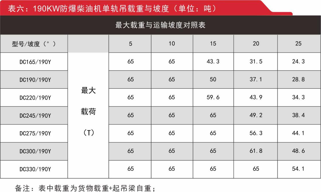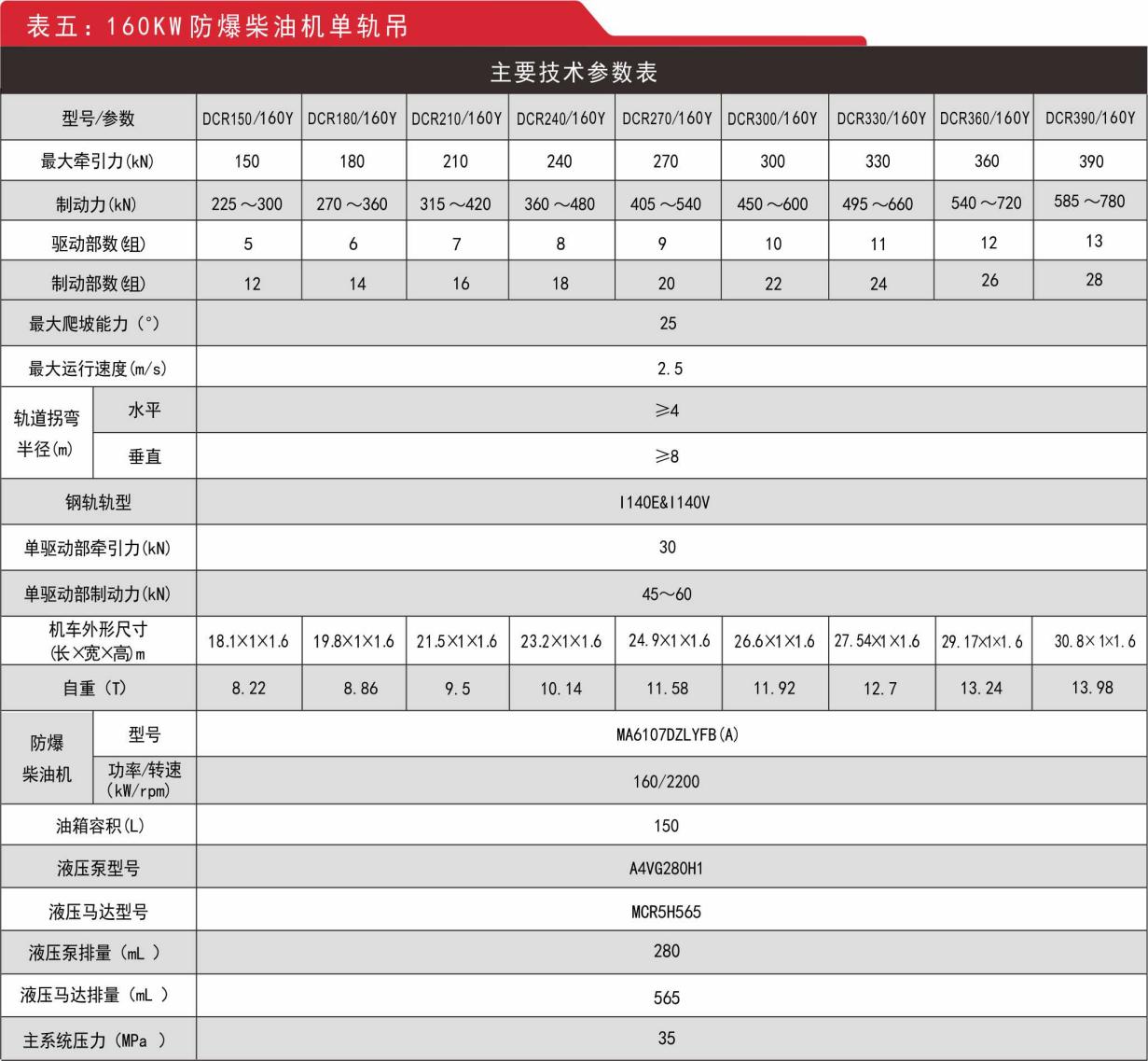 示列:型號DCR390/160Y,表示額定牽引力390KN,柴油機功率160KW,柴油機動力液壓驅(qū)動單軌吊機車。
