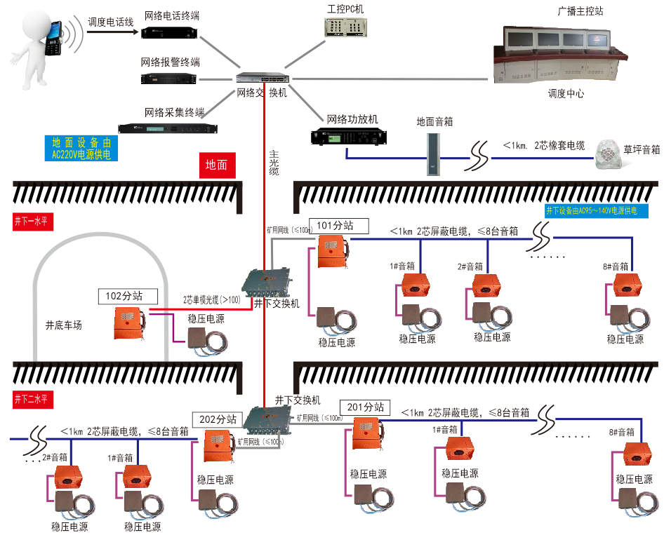 ◆ 系統(tǒng)采用“光電”傳輸:井下交換機(jī)至分站利用礦用光纜傳輸,分站至音箱利用礦用屏 蔽電纜傳輸;