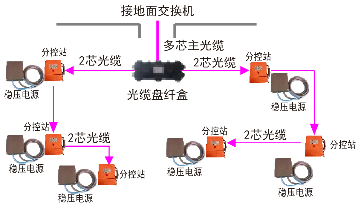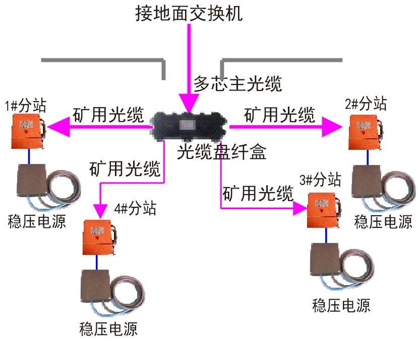 ◆ 多芯主光纜直接連接至地面交換機(jī),利用光纜盤纖盒分支連接至分站。