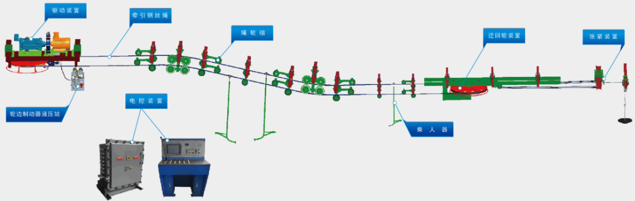 液壓驅(qū)動式架空乘人裝置,采用雙輪驅(qū)動的主要目的是增大圍包角和摩擦力。適用于長線路和大負(fù)載、高速架空乘人裝置,可以實(shí)現(xiàn)無級調(diào)速、軟啟動、軟停車功能。