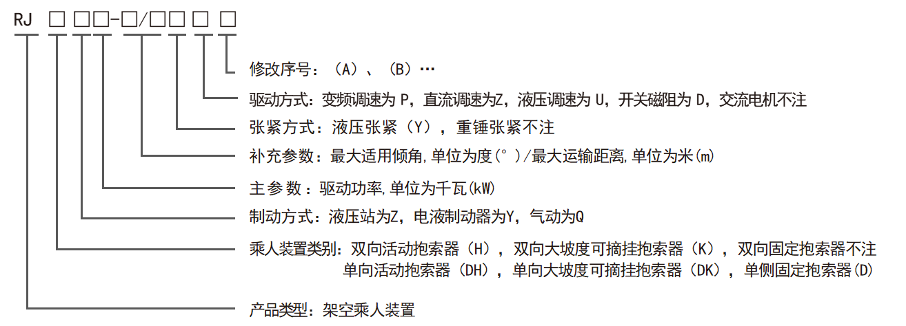 示例:采用交流電機(jī)傳動,電液制動器制動和重錘張緊,最大適用傾角18°,最大運(yùn)輸距離600m,驅(qū)動功率為22kw的活動抱索器架空乘人裝置:RJHY22~18/600(A)。
