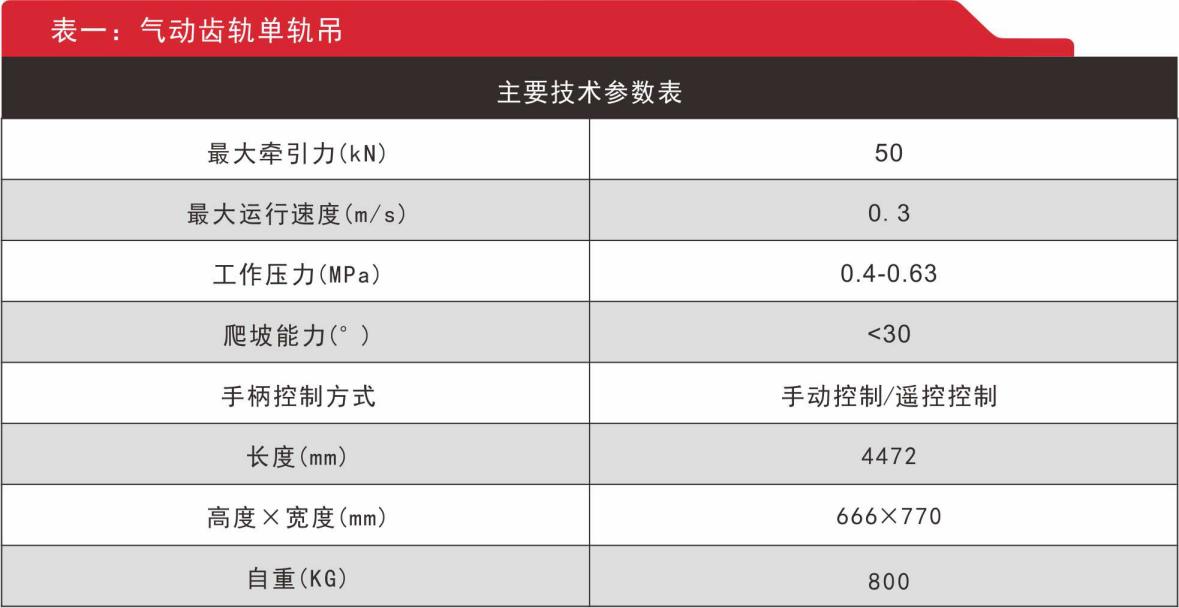 2.氣動齒軌單軌吊參數(shù)及負載表