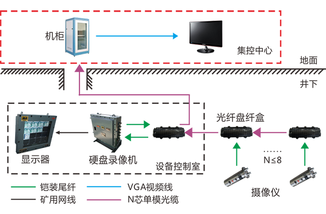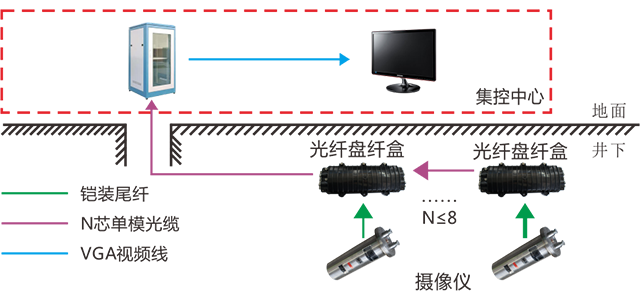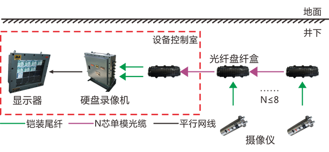 況進(jìn)行實(shí)時監(jiān)視,硬盤錄像機(jī)通過光纖接收視頻信號,通過顯示器進(jìn)行顯示和切換,實(shí)現(xiàn)地面和井下視頻信號實(shí)時顯示和存儲的目的。