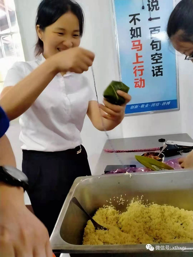 本次比賽共分為21組,每組4人,角逐"數(shù)量最多獎”和“最美粽子獎”。比賽前,進行了關于端午節(jié)相關知識及【中國銀行】和【湘潭恒欣】企業(yè)文化知識搶答。隨著【中國銀行】周行長吹響比賽口哨,活動氣氛高漲,平時在車間搬鐵動械、在家翹著二郎腿的大老爺們也開始像模像樣地“捉粽子”了;上得廳堂、下得廚房的女士們輕松地包了一個又一個有棱有角粽子。雖然比賽只有十分鐘,但速度可不慢,最快的一組共包了40多個粽子哦?!鞠嫣逗阈馈客聜冋f往年都是買粽子吃,今年可以吃到自己親手包的粽子,感覺特別好,特別幸福,印證了習大大的金句:“幸福是奮斗出來的”。